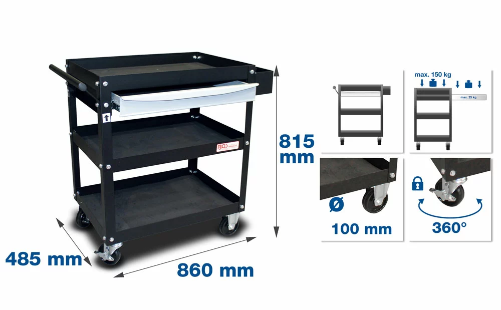 La servante d’atelier de BGS technic offre la solution parfaite pour l’organisation des outils et des petites pièces. Avec ses 3 étagères et son tiroir coulissant, elle offre un rangement clair de tes ustensiles de travail. Il dispose en outre d’un compartiment de rangement latéral pour encore plus d’espace de rangement. De construction robuste et stable, il est équipé de 2 roulettes pivotantes et de 2 roulettes blocables pour un transport sûr. La capacité de charge totale est de 150 kg, le tiroir peut être chargé jusqu’à 25 kg.