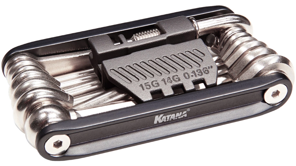 Que ce soit pour un voyage à vélo, une randonnée en VTT ou simplement pour se rendre au travail : le multitool X-19 de Katana est un outil indispensable pour les déplacements. Outre des outils de vissage importants dans des tailles fréquemment utilisées, ce multitool pratique contient également un rivet de chaîne, un écarteur de piston de frein et des clés à rayons.