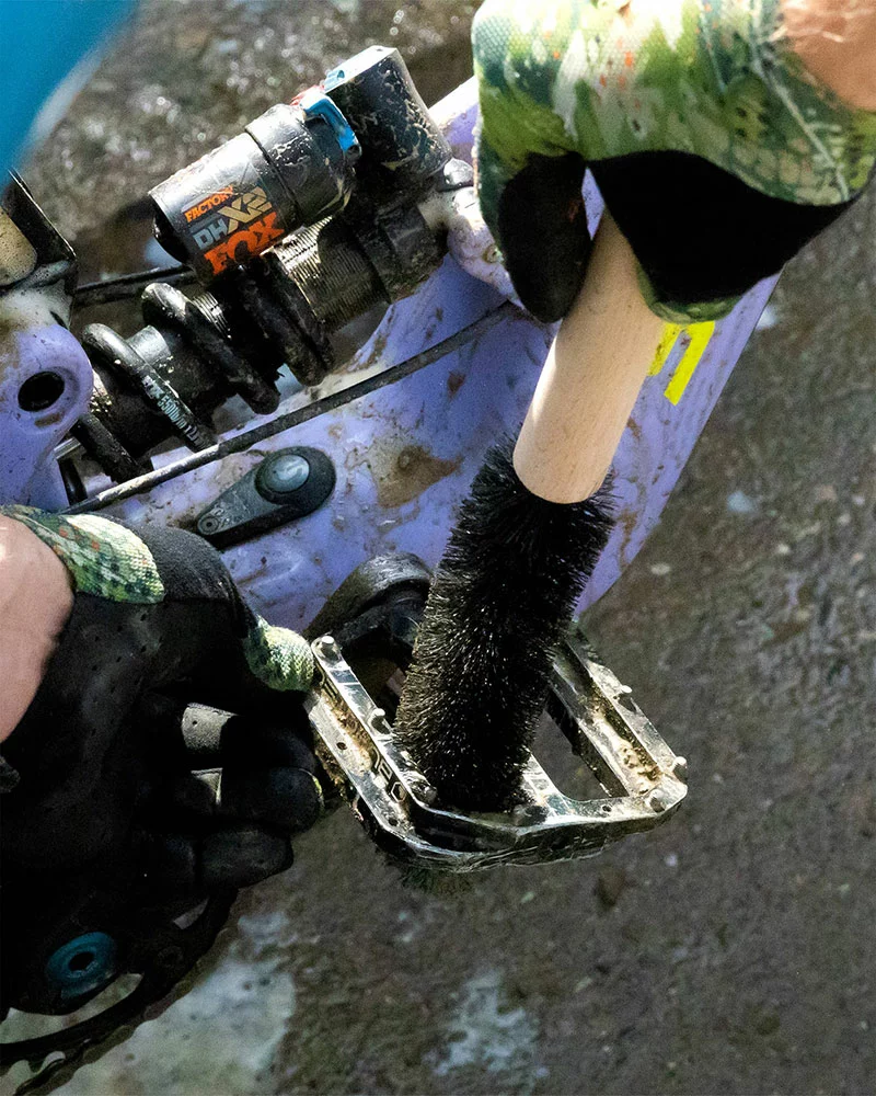 Cette fine brosse cylindrique avec un noyau en fil métallique est le complément parfait de la grande brosse et a été conçue pour atteindre les petits interstices difficiles à nettoyer comme les raccords de suspension, les pédales, les ponts de fourche, les haubans de selle, les moyeux et entre les rayons.
