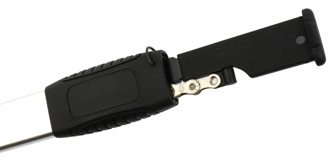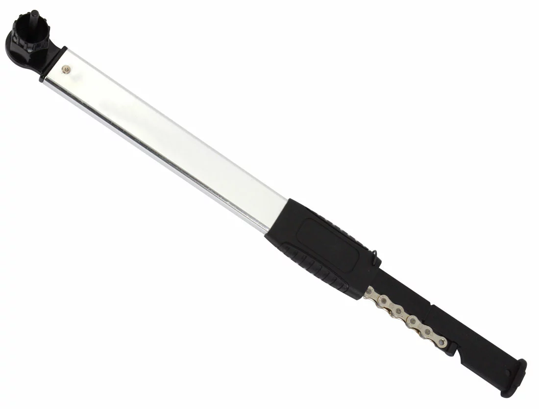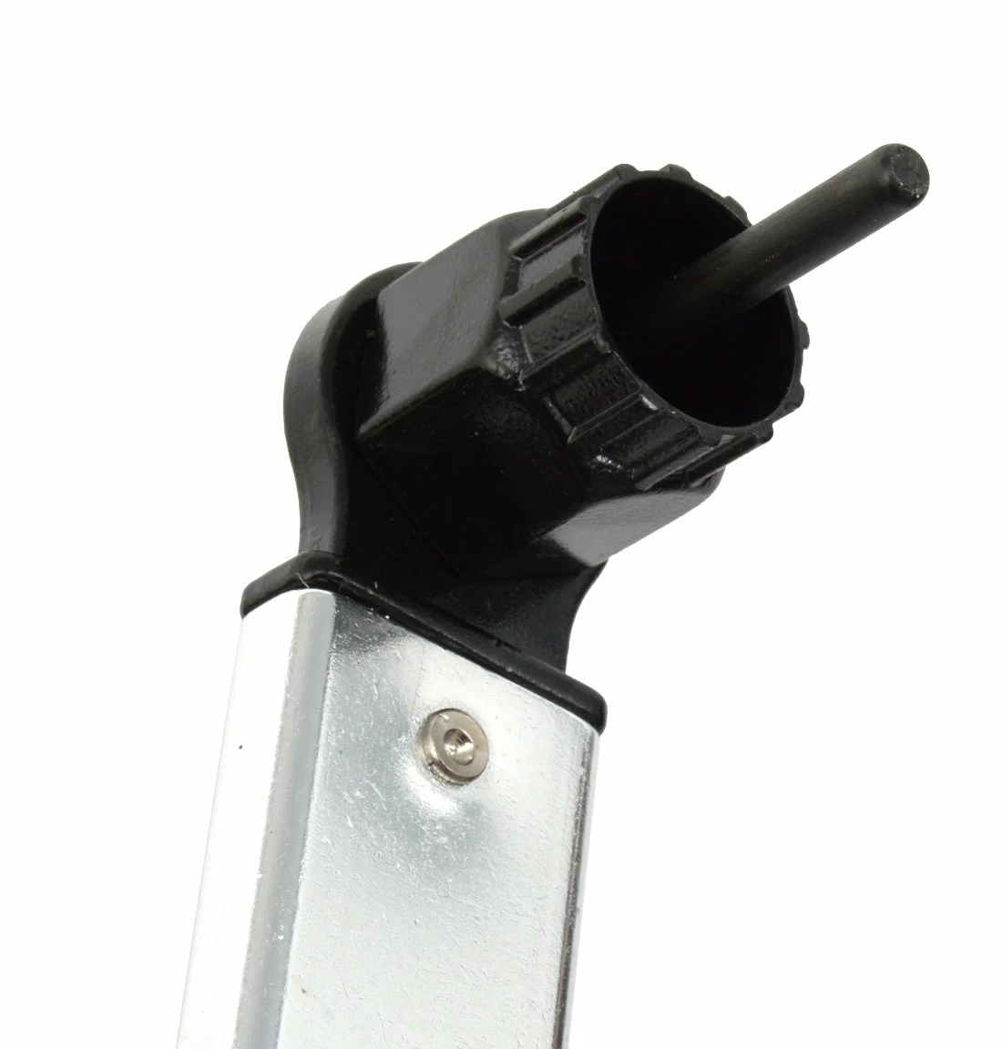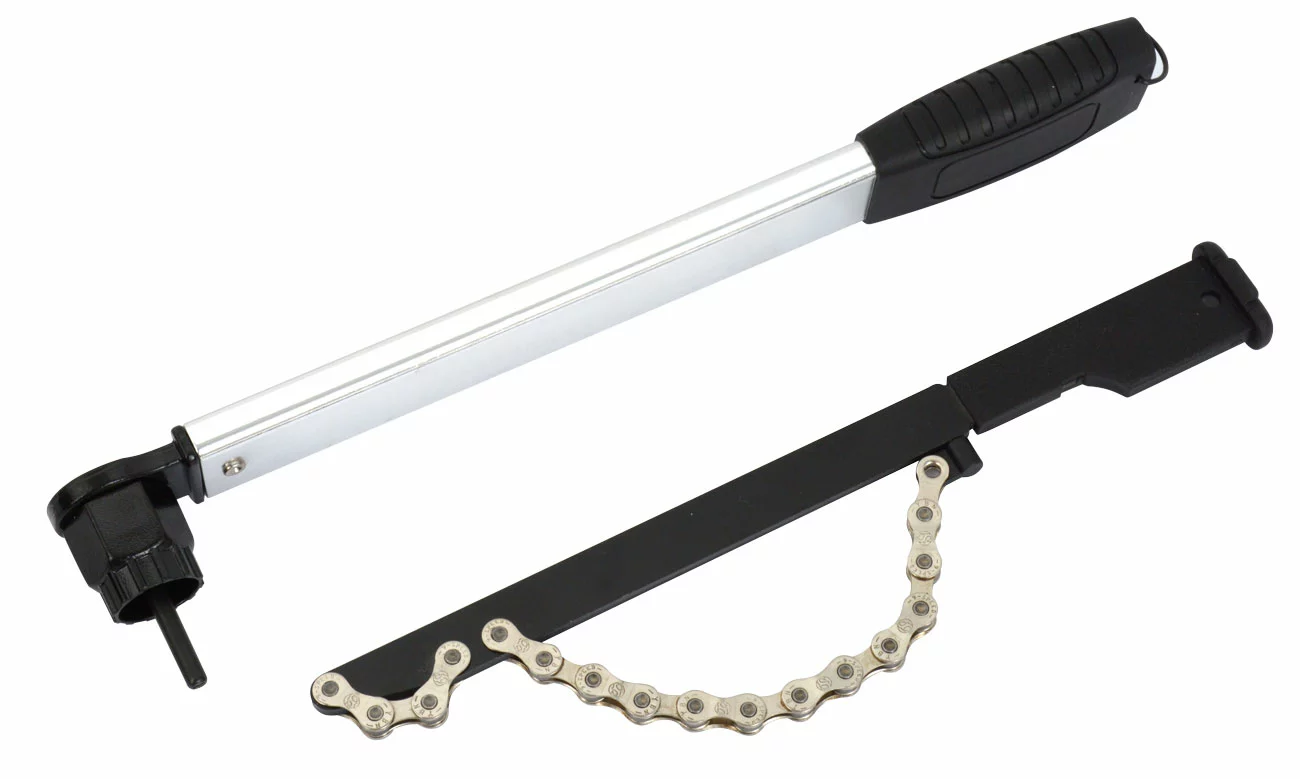 Le fouet à chaîne est un outil important pour le démontage de la cassette de la roue libre. Le fouet à chaîne permet d’appliquer un contrepoids afin de pouvoir desserrer le vissage de la cassette. Le fouet à chaîne maintient quasiment la roue libre par l’intermédiaire de la cassette, qui sert de contrepartie à la bague de fermeture et possède un filetage correspondant. C’est pourquoi un fouet à chaîne est toujours utilisé en combinaison avec un outil pour la bague de fermeture (extracteur de couronne) afin de retirer la cassette. Dans ce kit pratique, ils sont même intégrés l’un dans l’autre.