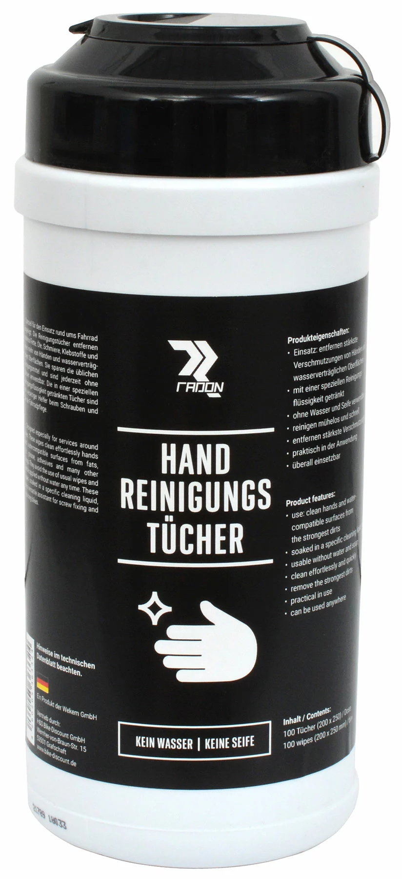 Les lingettes nettoyantes pour les mains Radon sont spécialement conçues pour une utilisation autour du vélo. Ces lingettes éliminent facilement les graisses, les huiles, les lubrifiants, les colles et bien d’autres substances des mains et des surfaces compatibles avec l’eau. Imprégnées d’un liquide nettoyant spécial, ces lingettes sont un auxiliaire polyvalent pour la réparation et l’entretien des vélos.