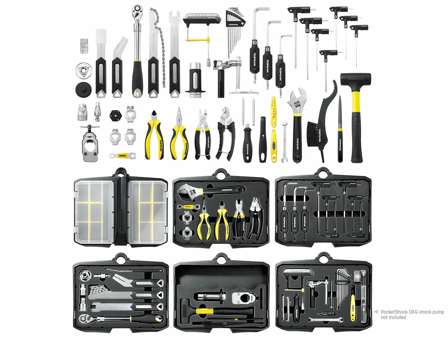Encore plus de choses dans la PrepStation Pro de Topeak : la station d’outils avec un outil supplémentaire, BucketSeat et un nouveau compartiment supplémentaire magnétique. Trousse à outils facile à manœuvrer avec des roulettes de 5″ et sept compartiments qui contiennent un set d’outils de 55 pièces de qualité professionnelle Bikeshop. Les roulettes peuvent être facilement étendues pour augmenter la stabilité. Une simple pression sur un bouton permet d’ouvrir le système pour séparer les plateaux d’outils.