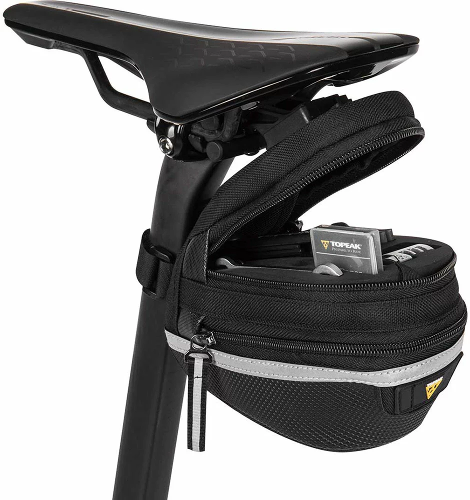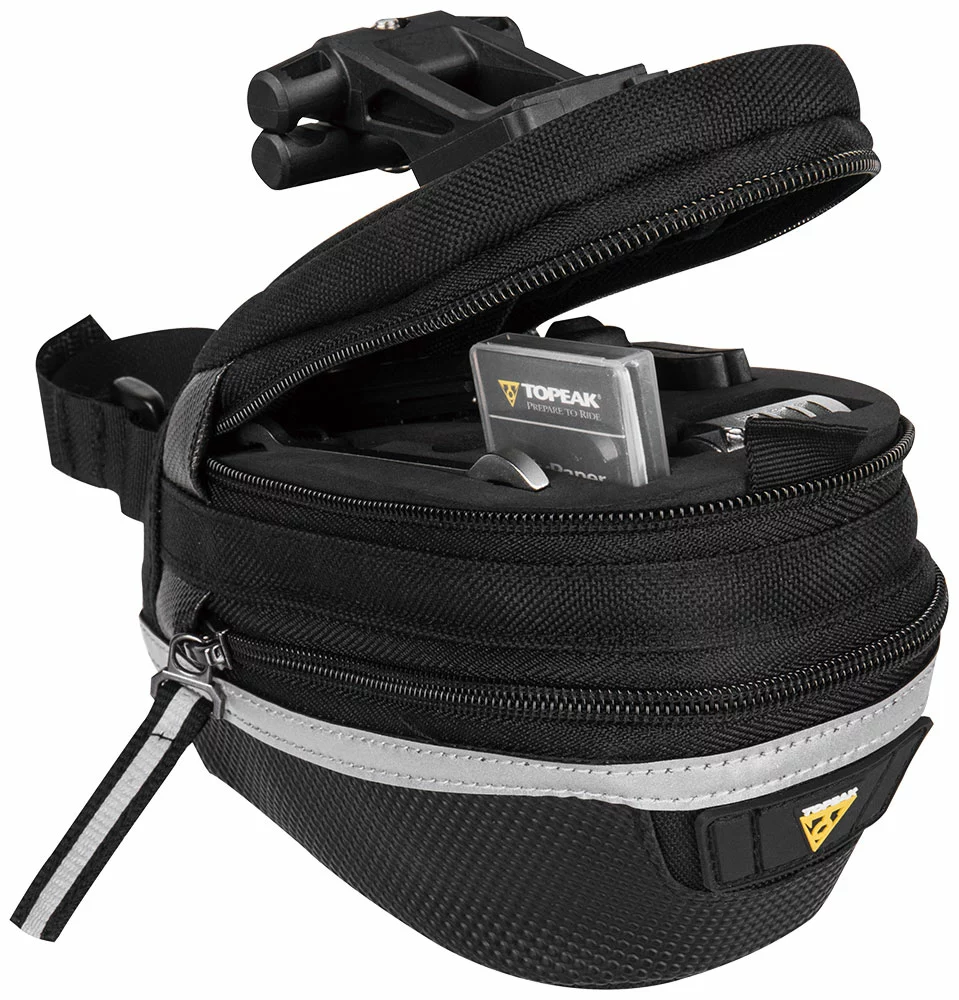 Le Survival Tool Wedge Pack II, qui contient un set de 17 outils, est fabriqué en 1000 deniers particulièrement robuste, possède une fermeture éclair sur tout le pourtour et une bande réfléchissante 3M™ extra longue pour plus de sécurité dans l’obscurité. Fixation et démontage rapides et faciles grâce au système innovant QuickClick™ de Topeak.