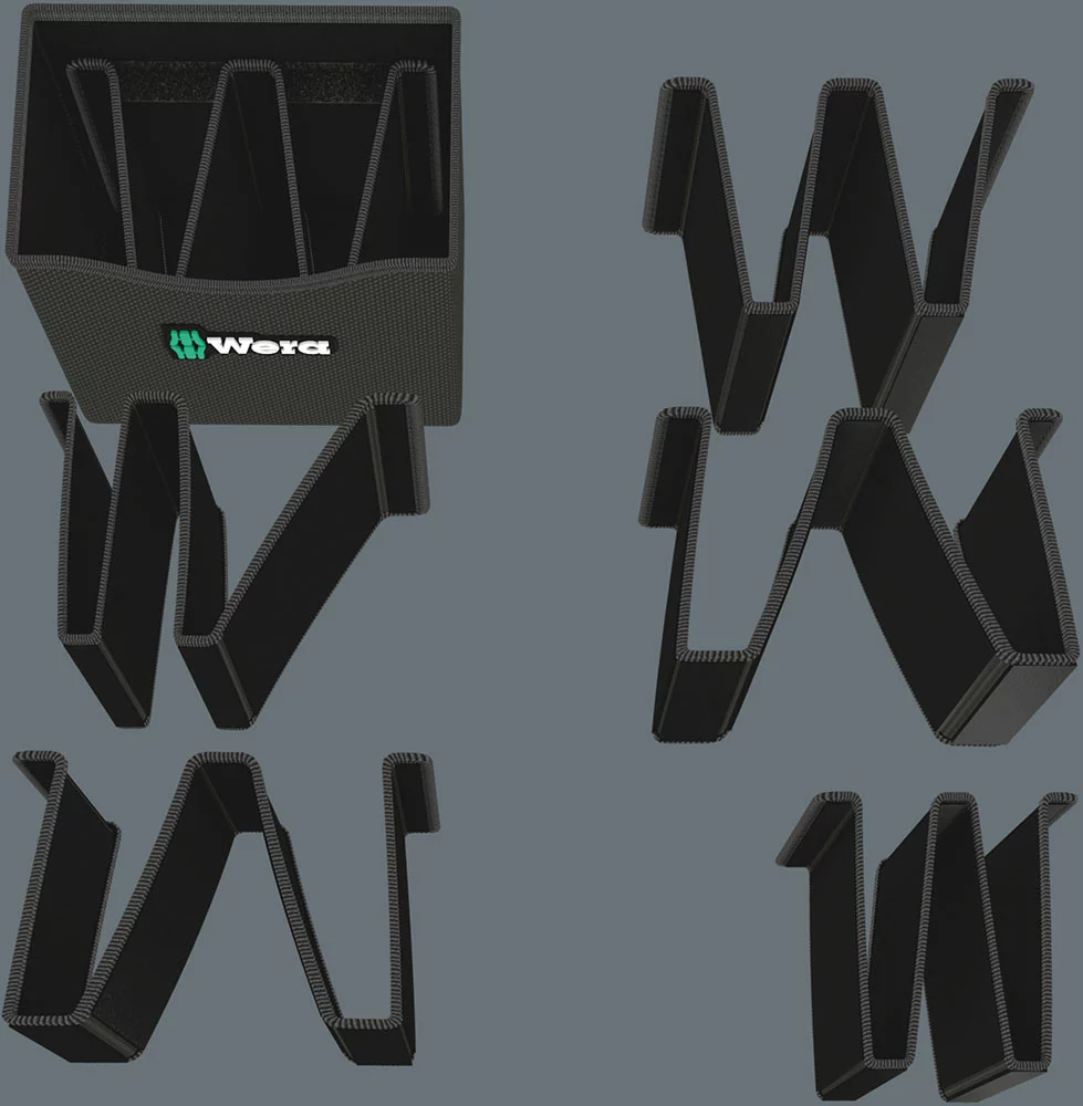 Grâce aux scratch intérieurs et extérieurs, toutes les compositions et accessoires Wera 2go peuvent s’y accrochés. Ceci permet une adaptation idéale à tous les métiers et habitudes de travail.