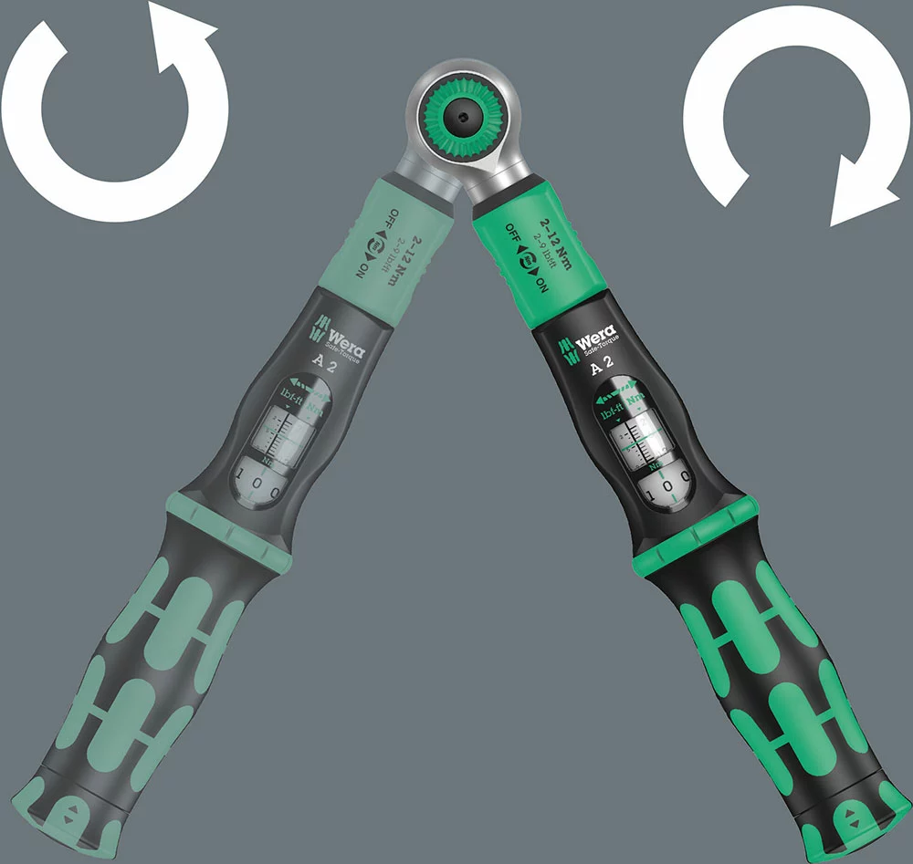 Clé dynamométrique Wera avec mécanisme à glissement et une plage de réglage de 2 à 12 Nm pour un serrage contrôlé à droite et à gauche. Une fois la valeur de couple réglée atteinte, la clé dynamométrique Safe-Torque A2 ne peut pas être dépassée, ce qui exclut l’application d’un couple trop élevé.